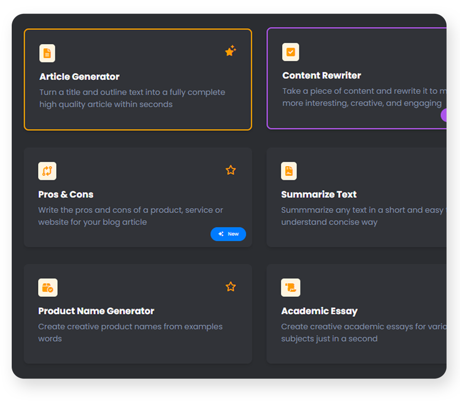 Escolha entre uma ampla variedade de ferramentas de IA para escrever anúncios para mídias sociais, seções principais, posts de blog, ensaios, etc...